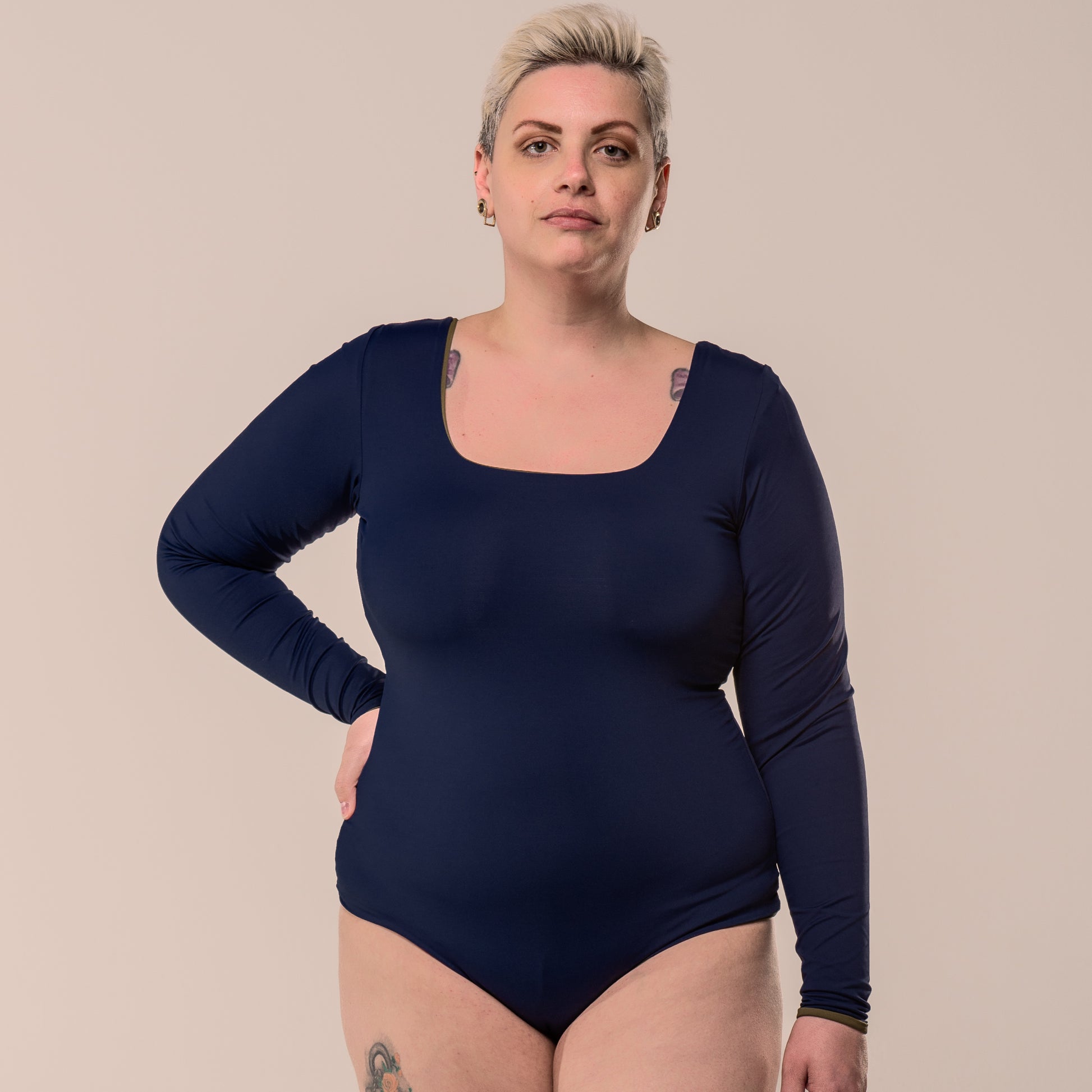Design 2 em 1: uma peça monocromática (para você que não gosta da outra cor aparecendo no decote), mas ainda com dois decotes (canoa e quadrado).